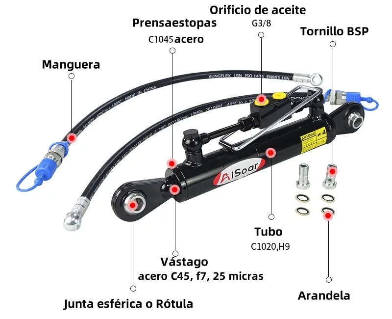 El tercer punto utiliza fluido hidráulico a presión para mover el pistón dentro del cilindro, facilitando los ajustes en la longitud del tercer punto. Los extremos de rótula proporcionan un punto de conexión giratorio, garantizando una amplia gama de movimientos y reduciendo la tensión en la articulación durante los movimientos operativos. Fabricados normalmente en acero de alta calidad o materiales similares, estos eslabones están diseñados para soportar cargas elevadas y condiciones duras. Algunos modelos con válvulas integradas incorporan válvulas de seguridad o control para regular la presión hidráulica y garantizar un funcionamiento suave.