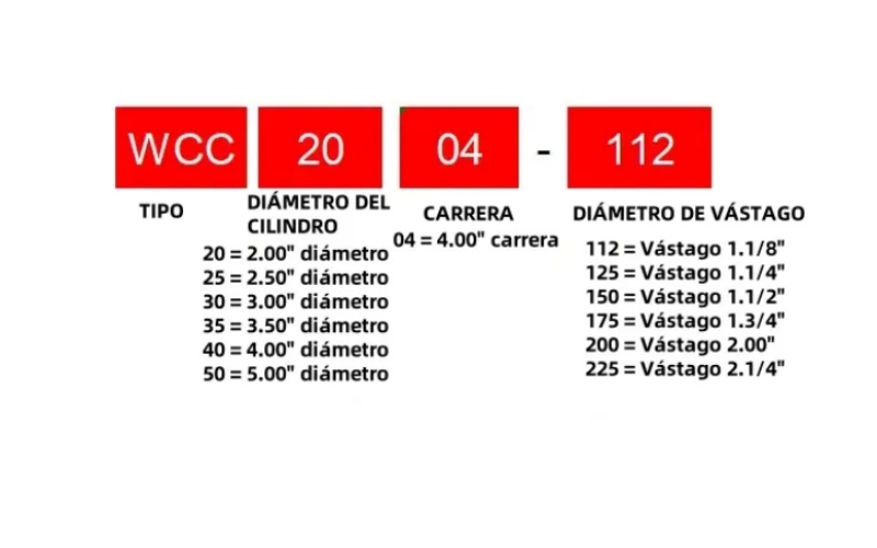 Sistema de código de modelo de cilindro soldado con montaje de horquilla. El WCC es un sistema completo de códigos utilizados para identificar y especificar los diversos componentes y especificaciones de los cilindros hidráulicos.